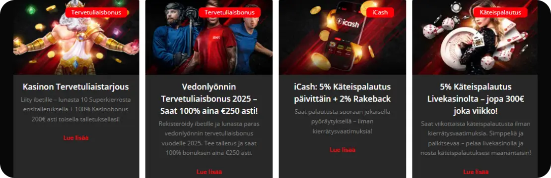 | iBet kertoimen korotukset | — | Kertoimen korotukset | Valikoidut kohteet ja markkinat; merkitty boost-merkinnällä vedonlyönnissä. |